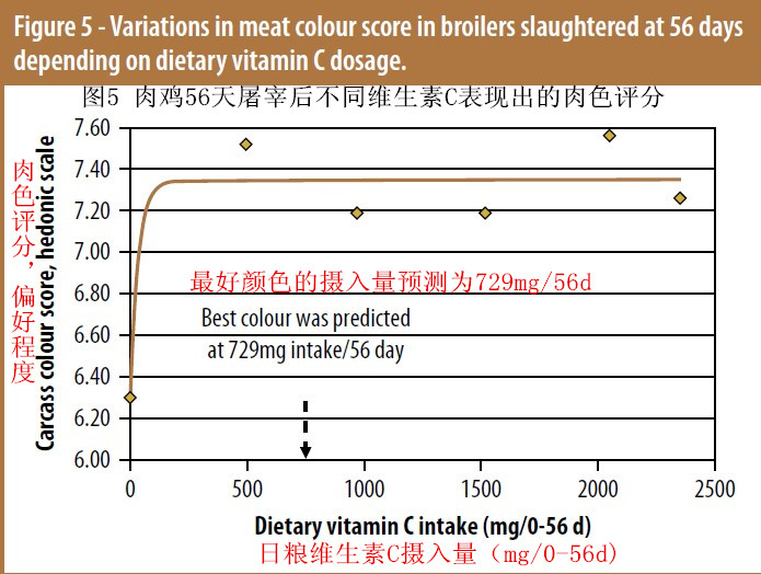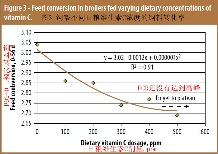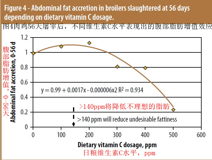 實驗檢測了日糧VC濃度或采食量和研究性狀間的次級非線性效應(yīng)(見圖2,3,4和5),表明體增重,AFA ,MCS和BMY(未顯示)達到了飽和狀態(tài)而FCR沒有。最后,效應(yīng)可以成立數(shù)據(jù)的非線性模型。基于100%的漸近線,推斷出300ppm和301ppm為日糧水平時,可分別最大程度提高體增重和BMY。攝入量為729mg時,換算為日糧水平為150ppm,是最佳MCS的模型水平。FCR效應(yīng)還需要進一步的研究,這超出了當前的研究范圍(圖3),600ppm被預測為優(yōu)化FCR的水平。這個值表現(xiàn)出較低的代謝轉(zhuǎn)化率,這是我們的分析表明可消化VC用于體重增值的利用率及線性遞減邊際效應(yīng)比較低。研究人員印象特別深刻的趨勢是AFA效應(yīng)(圖4),這表明了VC添加與AFA之間的負向相關(guān)。這是因為VC參與了肉毒堿代謝,后者是脂肪酸β-氧化中的關(guān)鍵因素。他們計算出要改善肥胖特別是內(nèi)臟脂肪,日糧必須提供>140ppm的 VC。不幸的是較低的和零水平的VC預混料在歐洲。巴西和北美市場中仍然普遍。盡管如此,肥胖依然是大多數(shù)肉類加工和廣大消費者面對的一個問題。總之,維生素C是一種日糧必須添加的營養(yǎng)素,它可積極地應(yīng)對壓力和疾病問題。日糧中最佳的水平取決于所選擇的性能指標,指標不同最佳水平也不同。養(yǎng)殖場營養(yǎng)學家建議,要檢測飼料/預混料中的維生素水平,使其與生產(chǎn)目標相匹配。同時還要考慮維生素C的化學穩(wěn)定性,因為VC是最不穩(wěn)定的維生素。